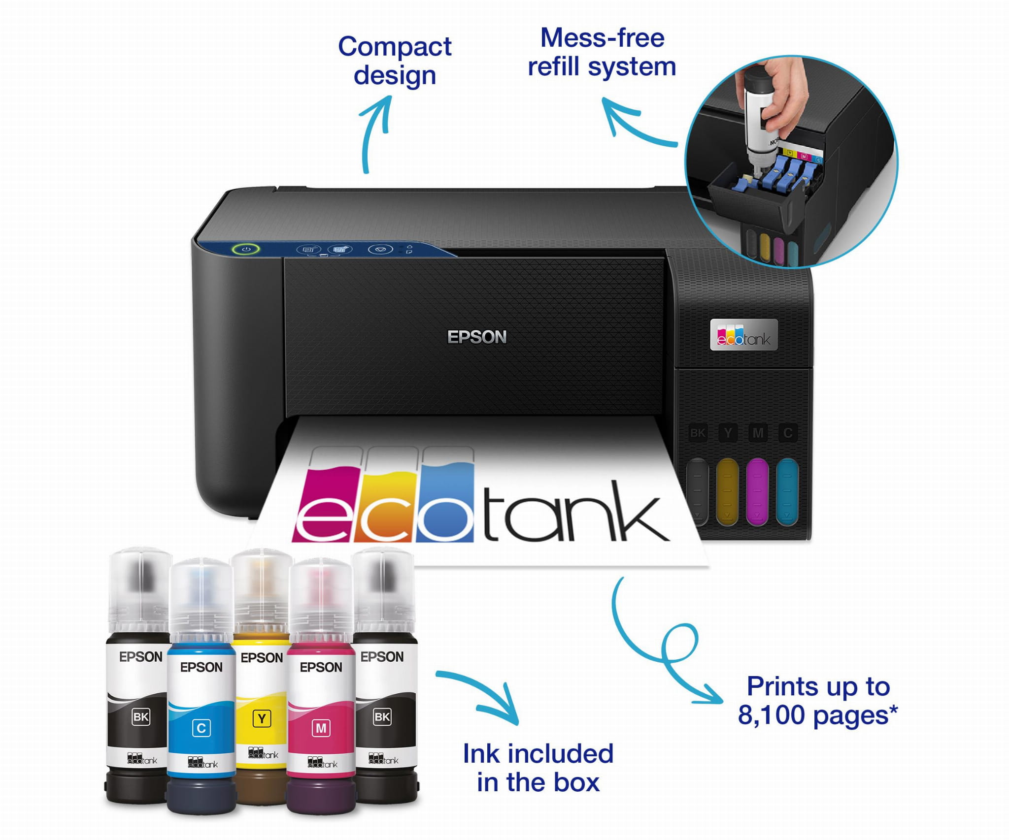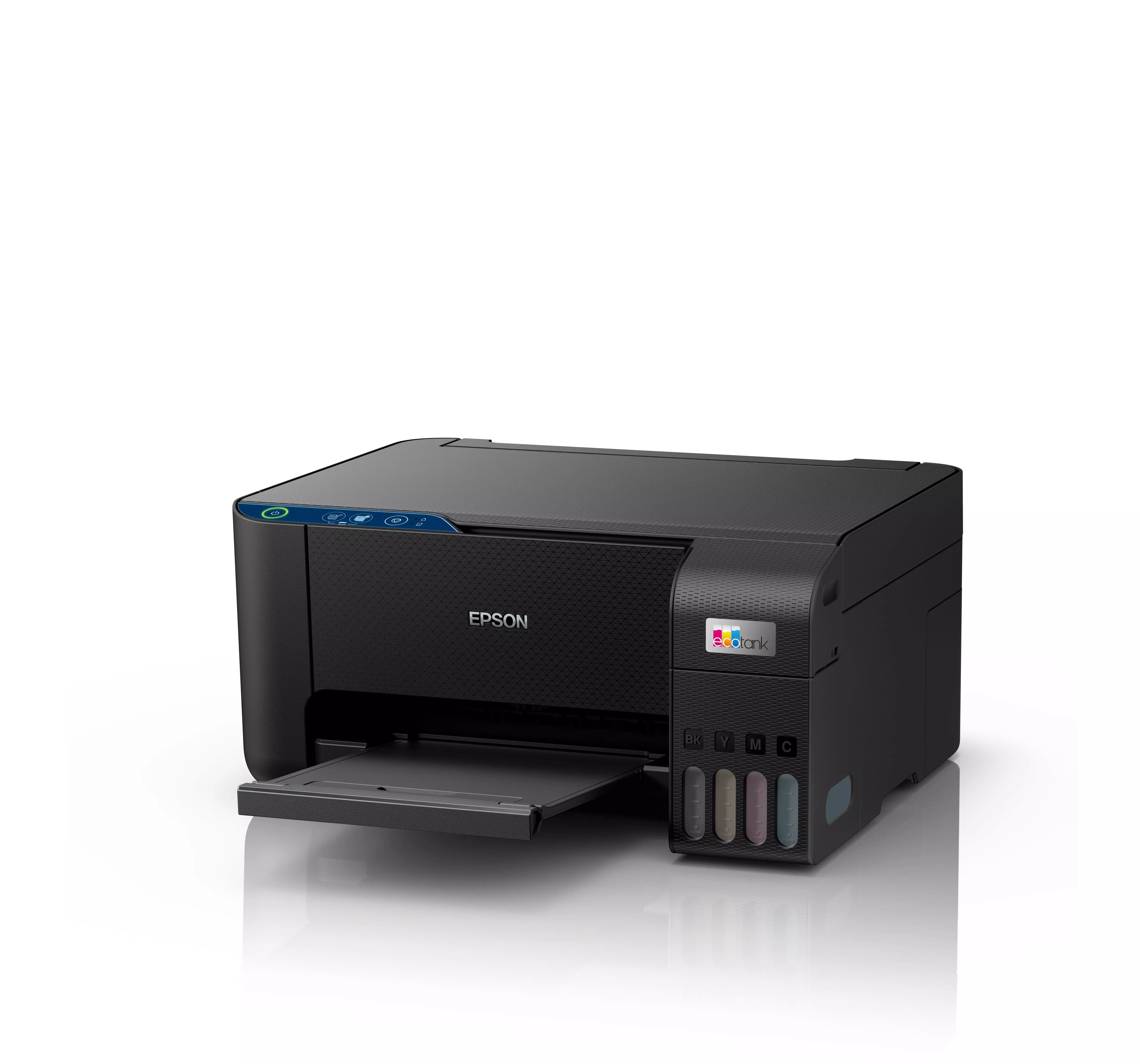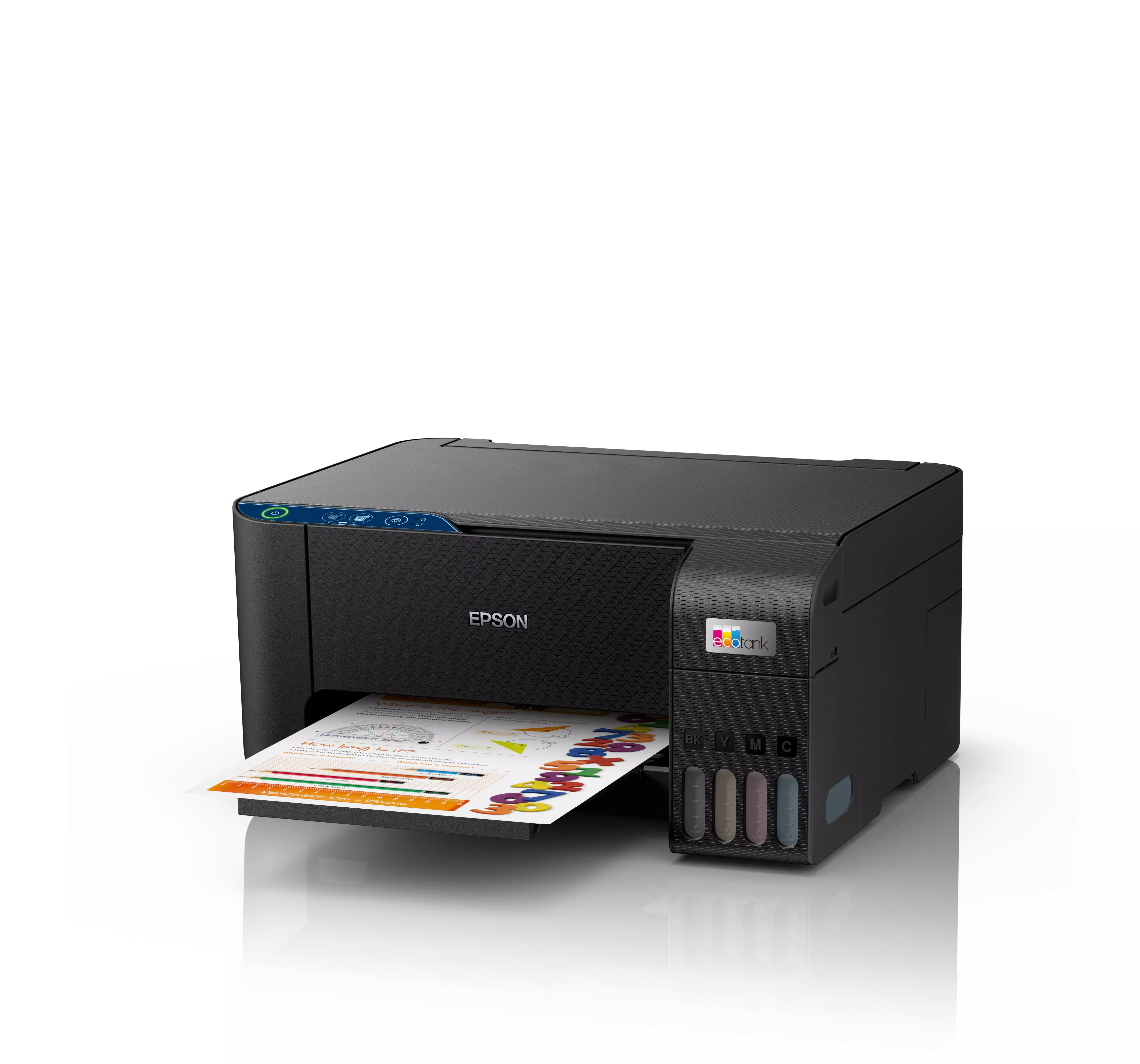 Drukarki EcoTank zapewniają bezproblemowe drukowanie w domu - Pojemniki na atrament o dużej pojemności można uzupełniać bez bałaganu, a butelki z blokadą zaprojektowano tak, aby dany kolor atramentu można było wlać tylko do odpowiadającego mu pojemnika. Wskaźnik poziomu atramentu znajduje się z przodu urządzenia, wyraźnie informując użytkownika, kiedy należy go uzupełnić.
