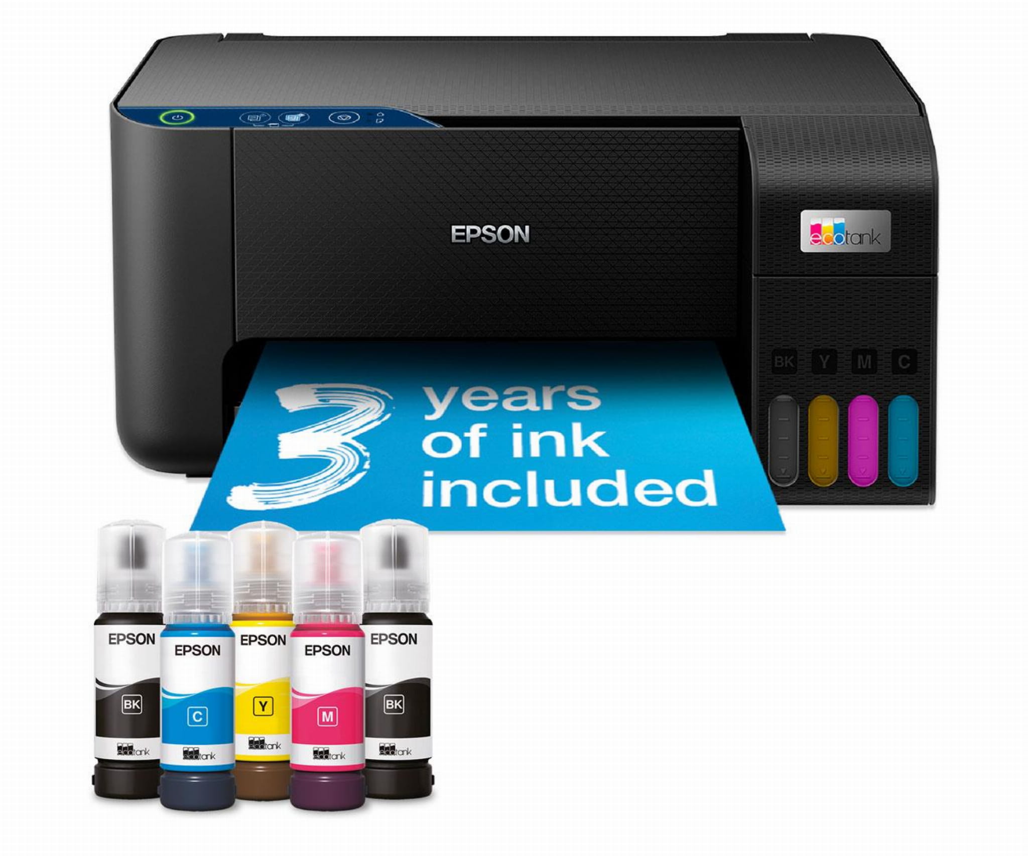 Ta ekonomiczna drukarka pozwala zaoszczędzić do 90% na kosztach druku* i zawiera w zestawie atrament wystarczający nawet na 3 lata*. Dołączony atrament pozwala wydrukować do 8100 stron w czerni i 6500 stron w kolorze*. Zamienne butelki z atramentem stanowią równowartość 66 kartridżów*.