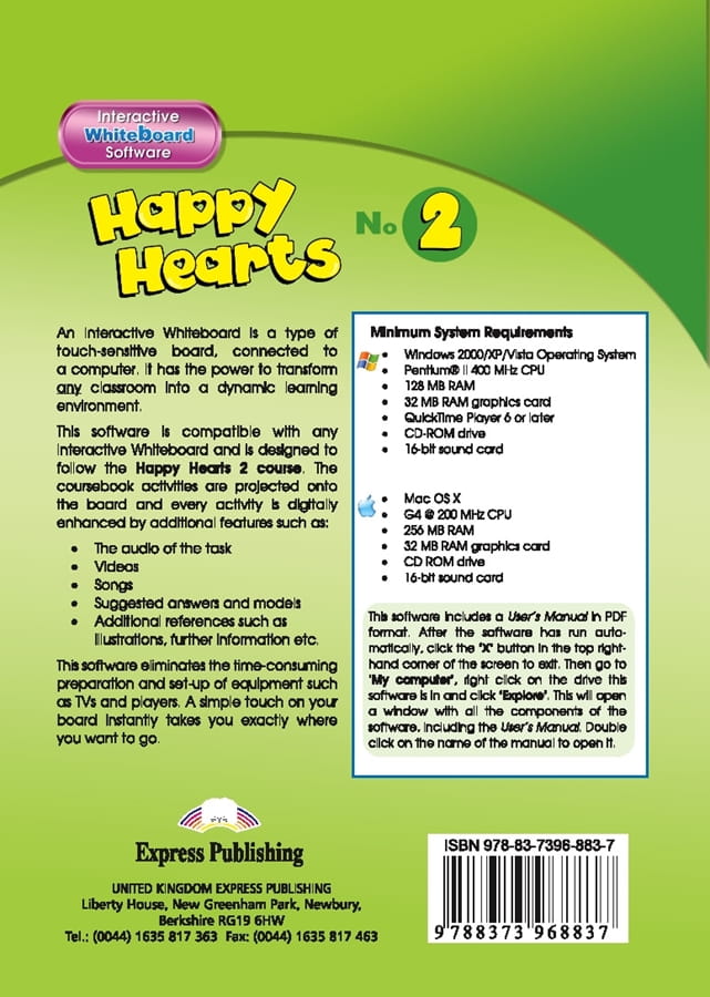 - ćwiczenia (Activity Books) do książek Happy Hearts 1 & 2, przeznaczone do pracy w domu lub podczas zajęć, utrwalające poznany materiał językowy;