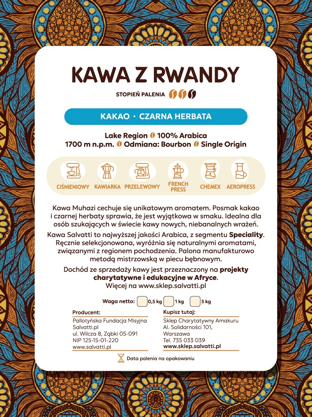 Twoja kawa Salvatti powstaje w małej, kameralnej palarni, które spełniają wymóg „Speciality”. To wszystko dzięki ręcznie zbieranym i wyselekcjonowanym ziarnom, które zapewniają szlachetność smaku i tak wiele korzyści dla zdrowia. Każdego ranka możesz cieszyć się wyjątkową kompozycją aromatów i być zmotywowanym do działania – to zapewni Ci każda kropelka kawy. Twojej kawy Muhazi.