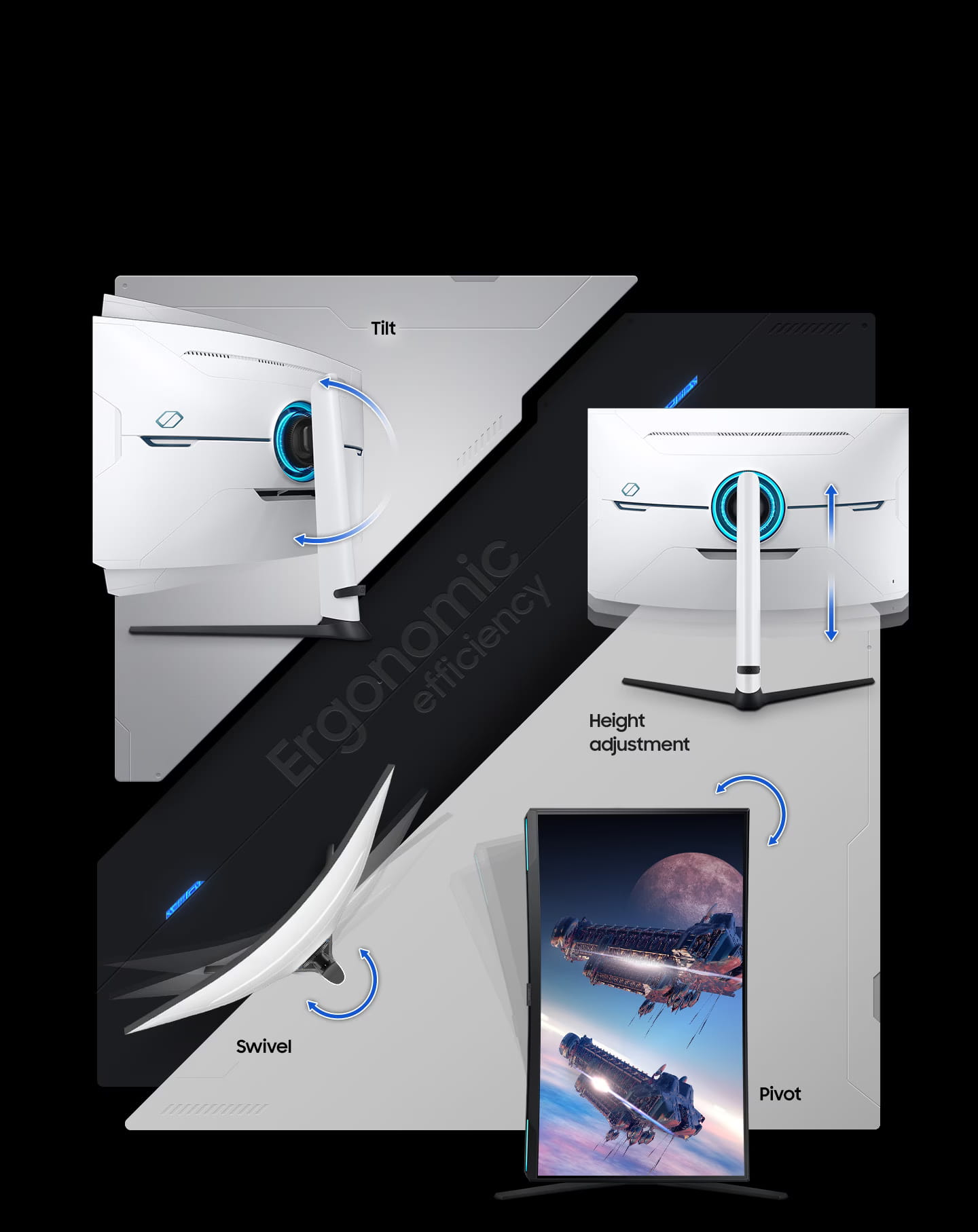 Znajdź zwycięską pozycję. Obracaj, przechylaj i reguluj wysokość, aż znajdziesz zwycięską konfigurację. Monitor jest w pełni kompatybilny z uchwytem w standardzie VESA i można go łatwo ustawić w idealnej pozycji. Jest też wyposażony w liczne łatwo dostępne porty, co pozwala bez problemu podłączyć twoje ulubione urządzenia.