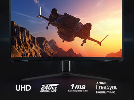 Jedno potknięcie może zadecydować o zwycięstwie lub porażce. Wspinaj się na szczyt tabeli dzięki pierwszemu na świcie monitorowi gamingowemu 4K z szybkością odświeżania 240 Hz, czasem reakcji 1 ms oraz FreeSync Premium Pro.