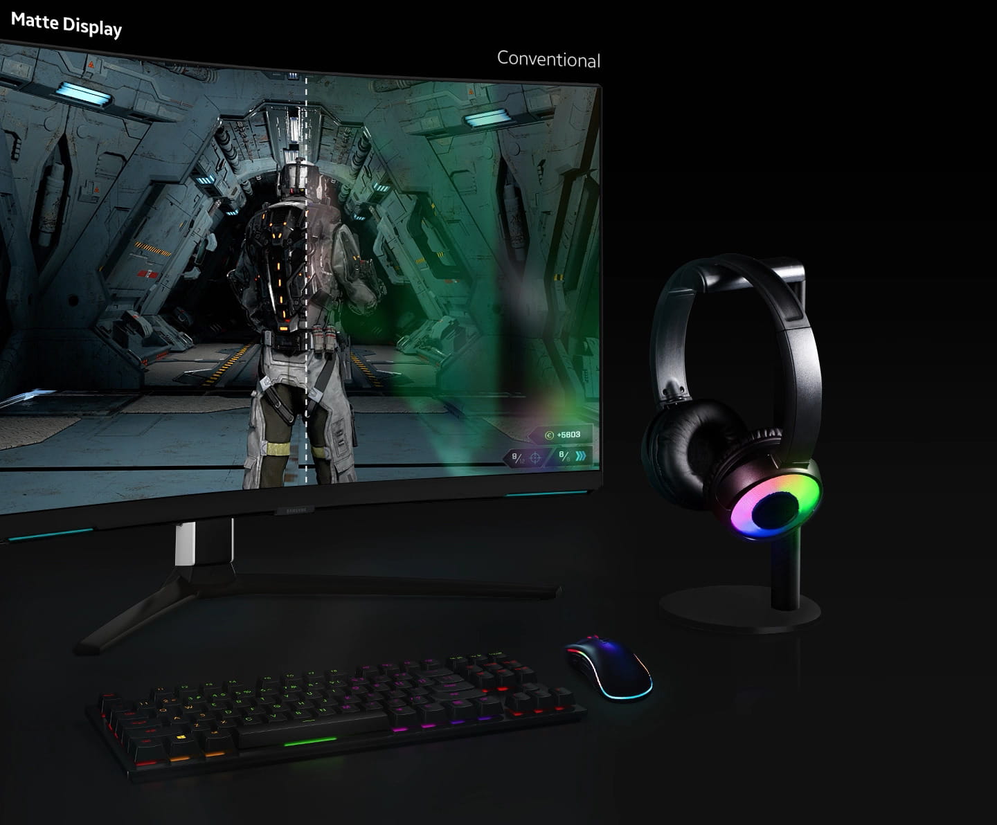 Skupiaj się tylko na tym, co ma znaczenie. Matowy ekran pochłania sztuczne i naturalne światło zamiast je odbijać, dzięki czemu eliminuje czynniki rozpraszające i pozwala ci w pełni skupić się na najtrudniejszych walkach i najwyższych poziomach trudności.
