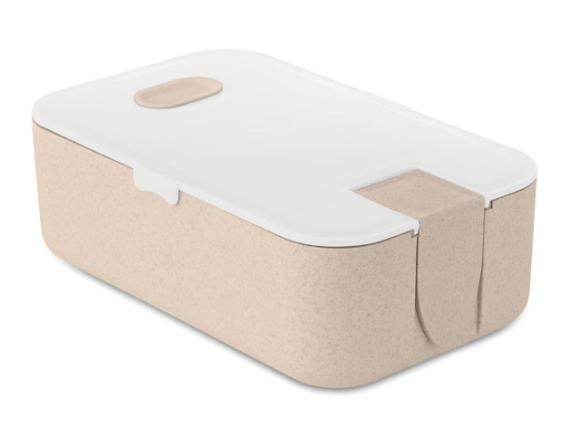 Lunchbox wykonany w 50% z włókien słomy pszennej i w 50% z PP. Pokrywa z PP z wbudowanym stojakiem na telefon.