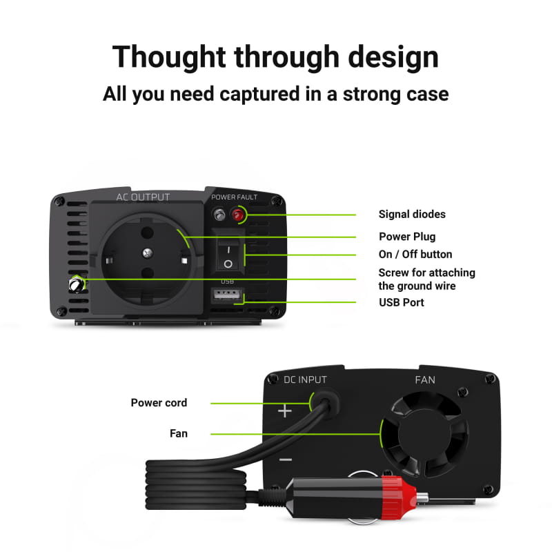 Dzięki przemyślanej konstrukcji użytkowanie przetwornicy napięcia jest łatwe, bezpieczne i komfortowe.Z przodu przetwornicy - w zalezności od modelu - znajduje się jedno lub kilka gniazd sieciowych, dostosowanych do najbardziej popularnej europejskiej wtyczki schukoDzięki temu przetwornicę można wykorzystać do zasilania różnorakich urządzeń elektrycznych - od smartfonów po podkaszarkę, elektronarzędzia, myjkę ciśnieniową i wiele innych.