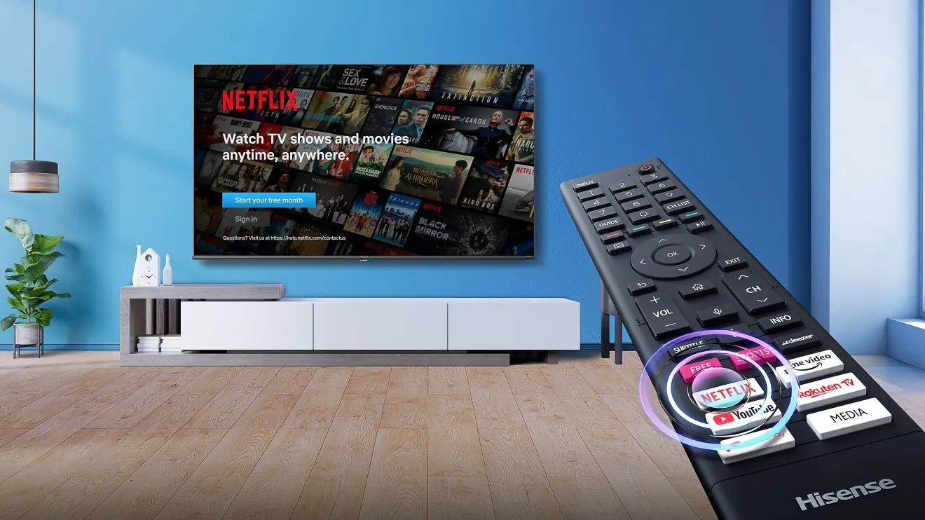 Wygoda w zasięgu pilota! TV Hisense oferuje bezpośredni i szybki dostęp m.in do serwisów Netflix, YouTube, Rakuten czy Prime Video poprzez 1 kliknięcie dedykowanego przycisku na pilocie, nawet gdy telewizor jest wyłączony. Dzięki temu zyskujesz błyskawiczny dostęp do ulubionych seriali.